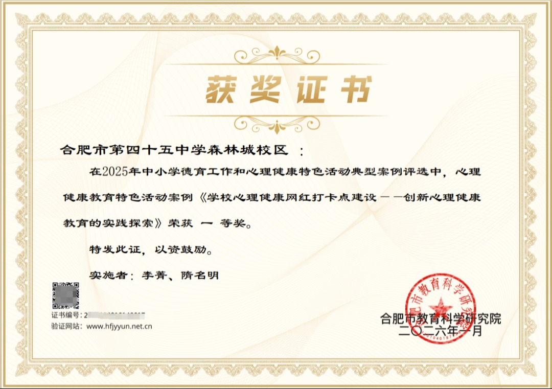 近日,2025年合肥市中小学德育工作和心理健康教育特色活动典型案例评选结果揭晓,合肥市第四十五中学森林城分校李菁、隋名明两位老师联合撰写的《学校心理健康网红打卡点建设——创新心理 ...