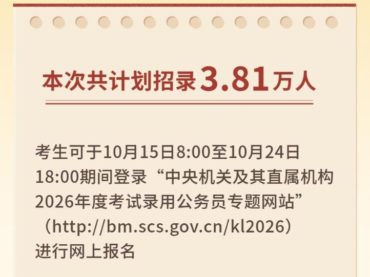 记者10月14日从国家公务员局获悉,中央机关及其直属机构2026年度考试录用公务员报名即将开始,共计划招录3.81万人。 考生可于10月15日8:00至10月24日18:00期间登录“中央机关及其直...