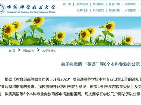10月8日,中国科学技术大学官网发布《关于拟撤销“英语”等6个本科专业的公示》。具体内容如下: 根据《教育部高等教育司关于开展2023年度通高等学 ...