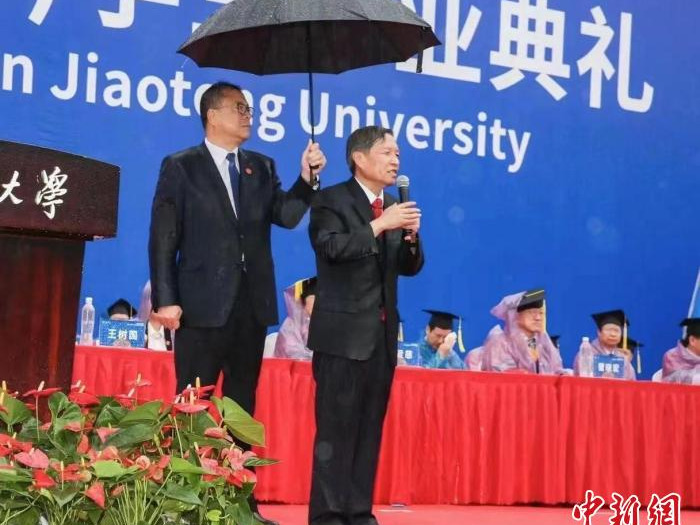 图为西安交通大学毕业典礼当日,该校党委书记卢建军为校长王树国撑伞。 西安交通大学供图 中新网西安7月9日电(杨英琦)随着中国各高校录取通知书陆续发出,2023年毕业季已近尾声。迎新 ...