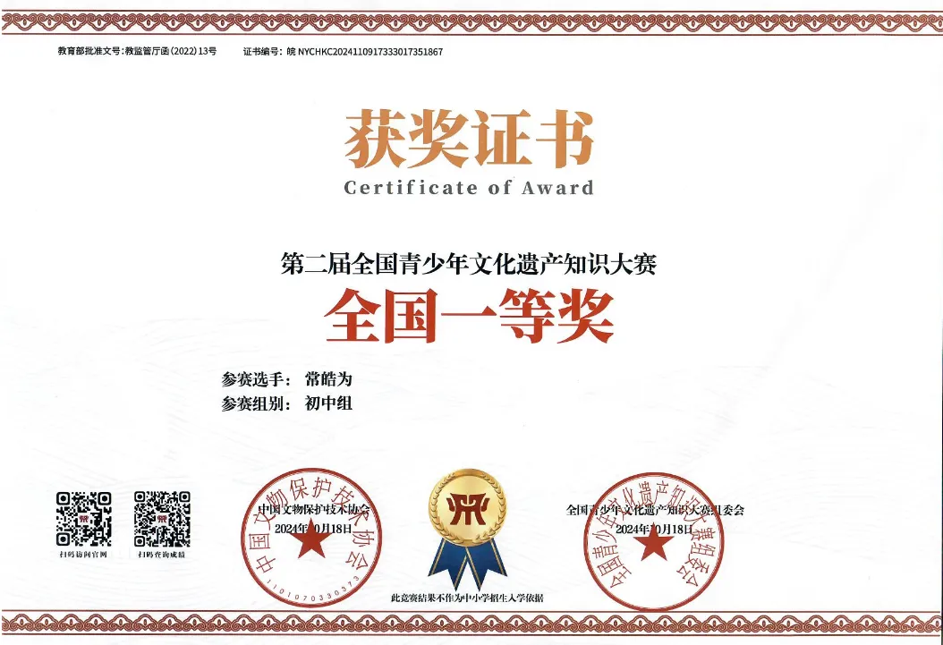 近日,第二届“全国青少年文化遗产知识大赛”奖项揭晓,合肥四十五中学子共获得省级奖项13项,国家级奖项6项,其中常皓为、朱露菲同学获国赛一等奖,徐睿迪、闫敏熙同学获国赛二等奖,张熠...