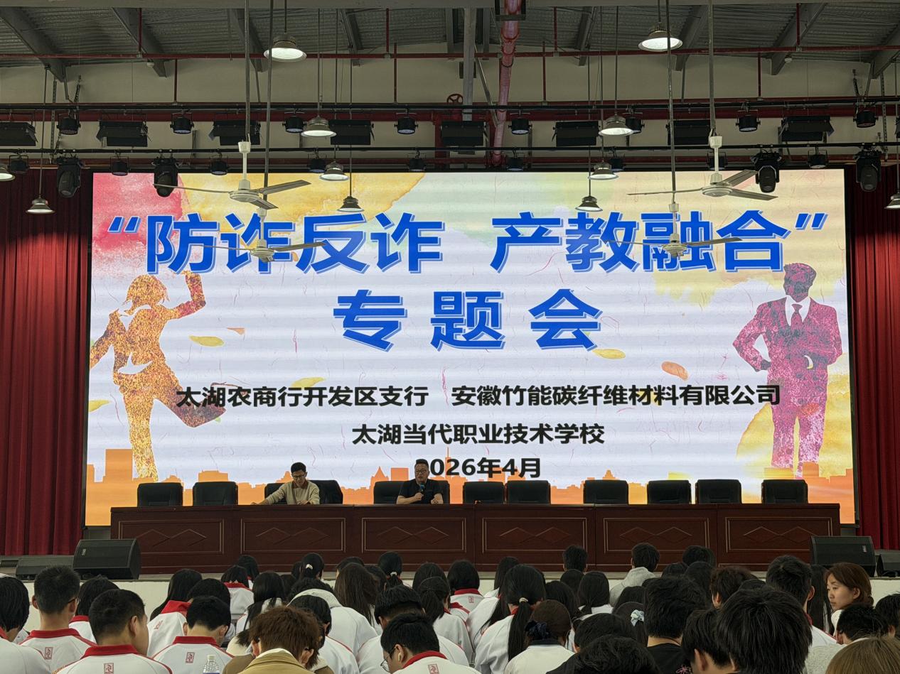 为切实守护高三毕业生财产安全,深化产教融合育人成效,拓宽学子就业渠道,4月10日,太湖当代职业技术学校联合太湖农商行开发区支行、安徽竹能碳纤维材料有限公司,为全体高三毕业生开展防...