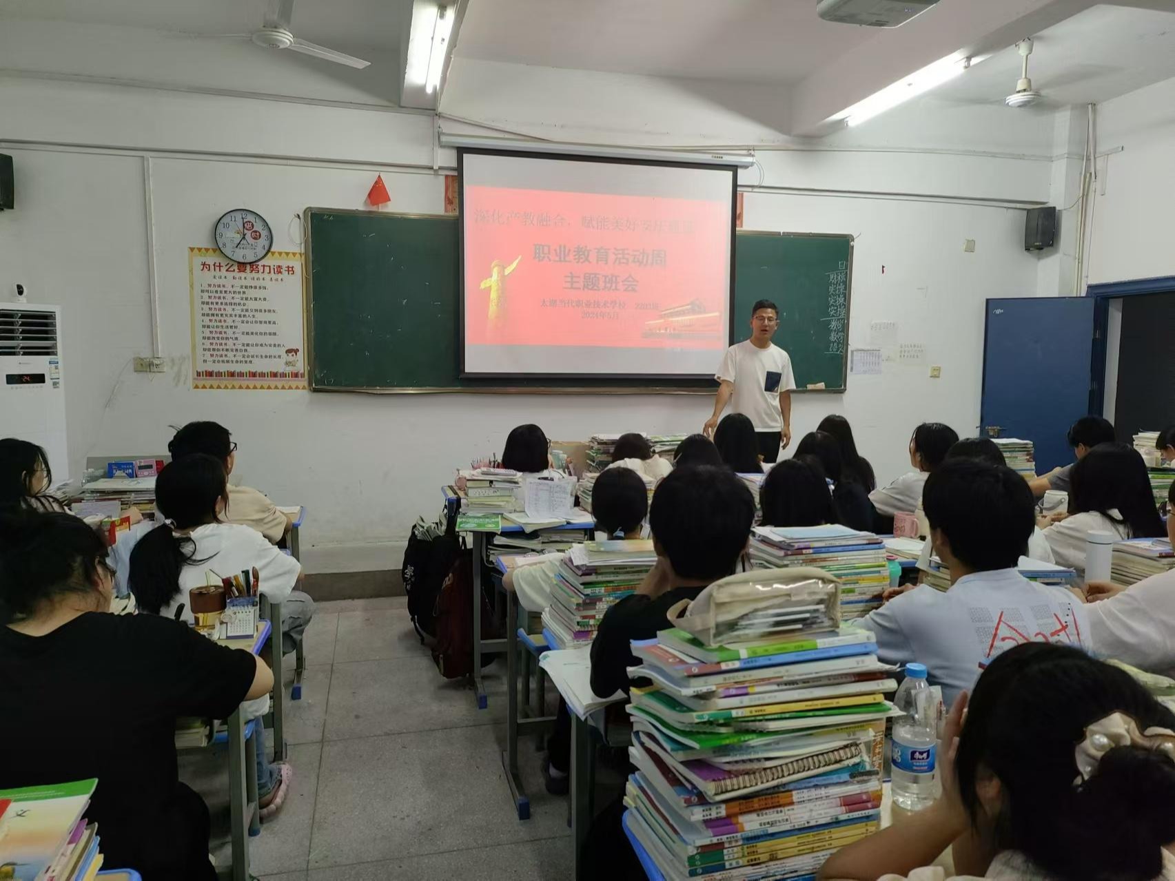 5月19日,太湖当代职业技术学校组织各班召开以“深化产教融合,赋能美好安庆建设”为主题的职教活动周主题班会。