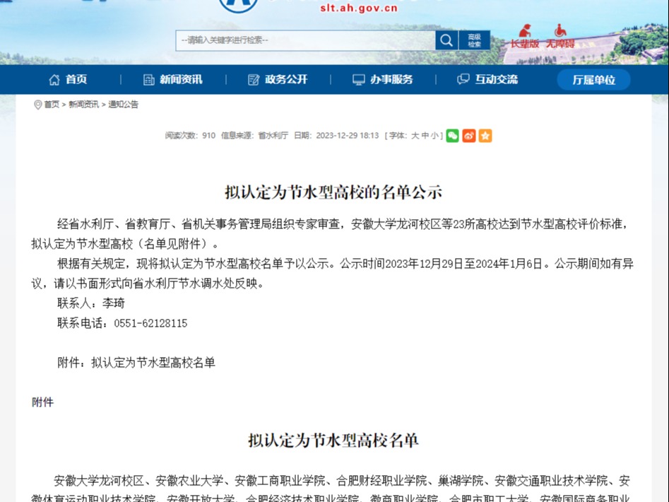 近日,安徽省水利厅、省教育厅、省机关事务管理局联合发布了安徽省节水型高校公示名单,根据专家评审,全省23所高校达到节水型高校评价标准,拟被认定为节水型高校,淮南职业技术学院榜上 ...