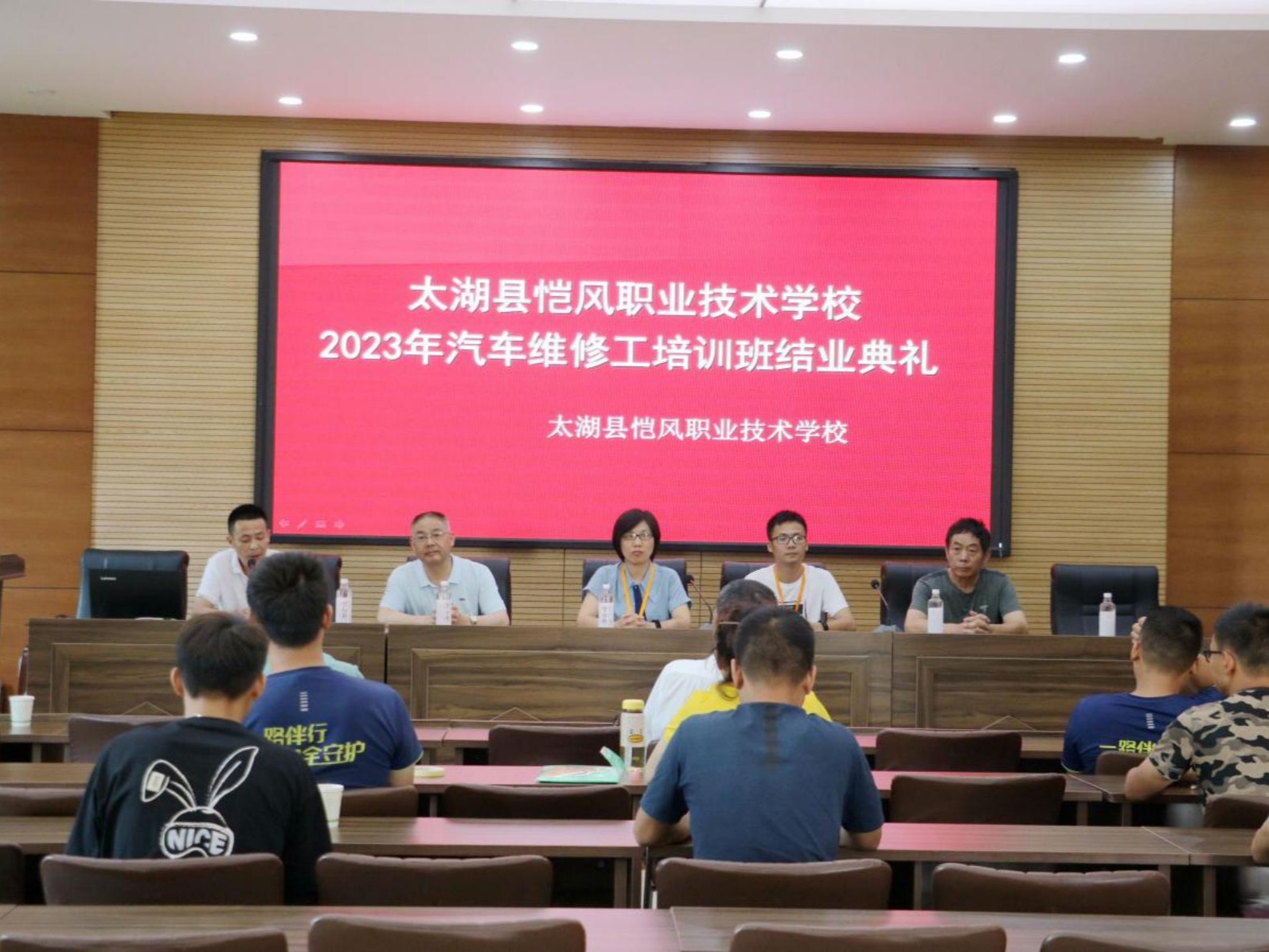 6月2日上午,太湖县恺风职业技术学校在学校多功能厅举行2023年第一期汽车维修工培训班结业典礼。太湖县人社局就业促进股股长姚刘娟、就业促进股汪俊豪、校长副校长殷同生出席。