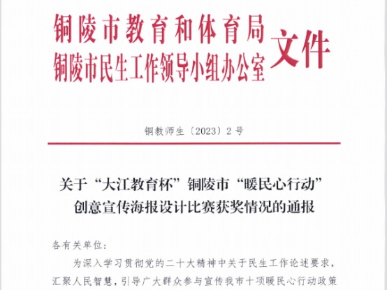 为汇聚人民智慧,引导广大群众参与宣传铜陵市十项暖民心行动政策内容,不断提升全市暖民心行动宣传质效,日前,铜陵市举办了“大江教育杯”铜陵市“暖民心行动”创意宣传海报设计比赛活动 ...