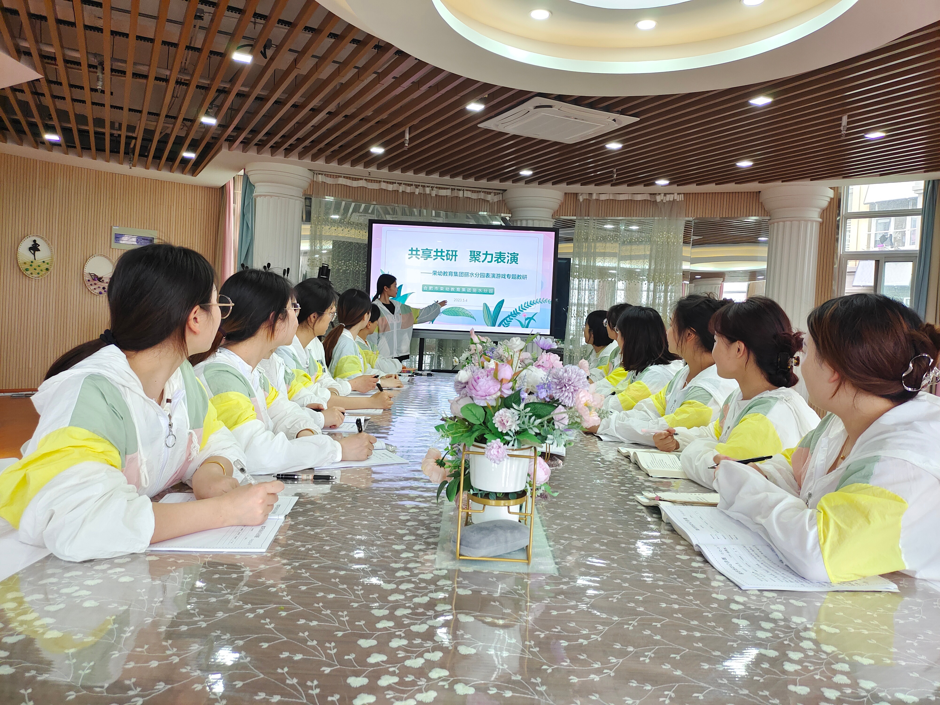 为解决各班级表演游戏中的实际问题,2023年5月4日,合肥市荣城幼儿园丽水分园全体教师齐聚会议室开展了“共享共研聚力表演”专题教研活动。