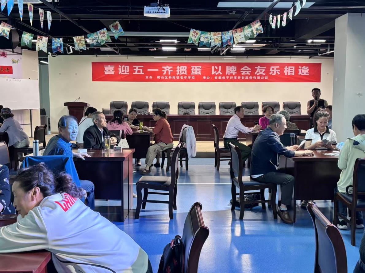 为丰富老年群体精神文化生活,营造欢乐祥和的五一节日氛围,4月27日,由合肥市蜀山区井岗镇老年学校主办、安徽省平行度养老服务有限公司承办、蜀山区阳光公益服务中心协办的“喜迎五一齐掼...