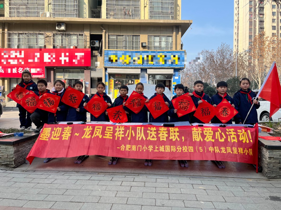 为了更好地传承国家非物质文化遗产——楹联,寒假里,合肥市南门小学上城国际分校四(5)中队龙凤呈祥小队开展了“送春联、献爱心”活动。