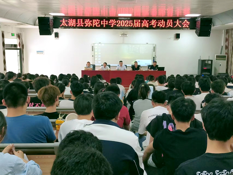 6月3日,太湖县弥陀中学2025年高考动员大会在多媒体教室举行,副校长蔡甘泉主持大会,学校党支部专职副书记周盛开,教务处、政教处及高三年级部全体师生参加大会。