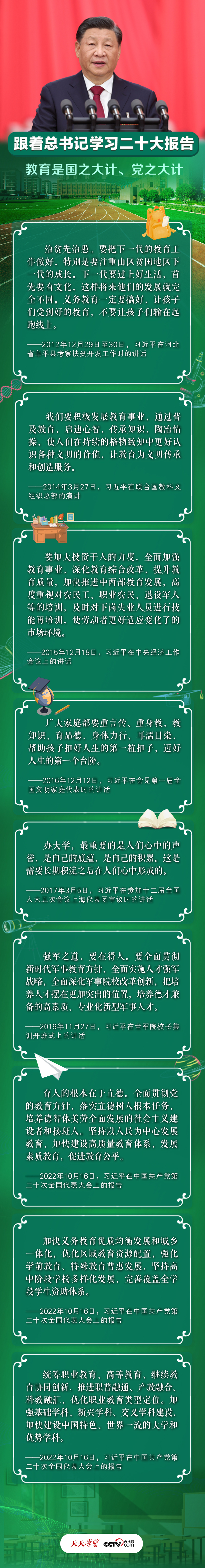 党的十八大以来,以习近平同志为核心的党中央高度重视教育事业,对教育工作作出了一系列重要部署和重要决策,推动教育事业取得历史性成就。习近平总书记曾在不同场合对义务教育、高等教育、家庭教育、职业教育等多方面作出重要论述。央视网《天天学习》特推出长图解,与您一同学习领会总书记的教育观。