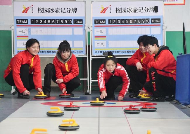 2月6日,在河北省邯郸市永年区第十中学,学生参加陆地冰壶训练。新华社发(胡高雷摄)