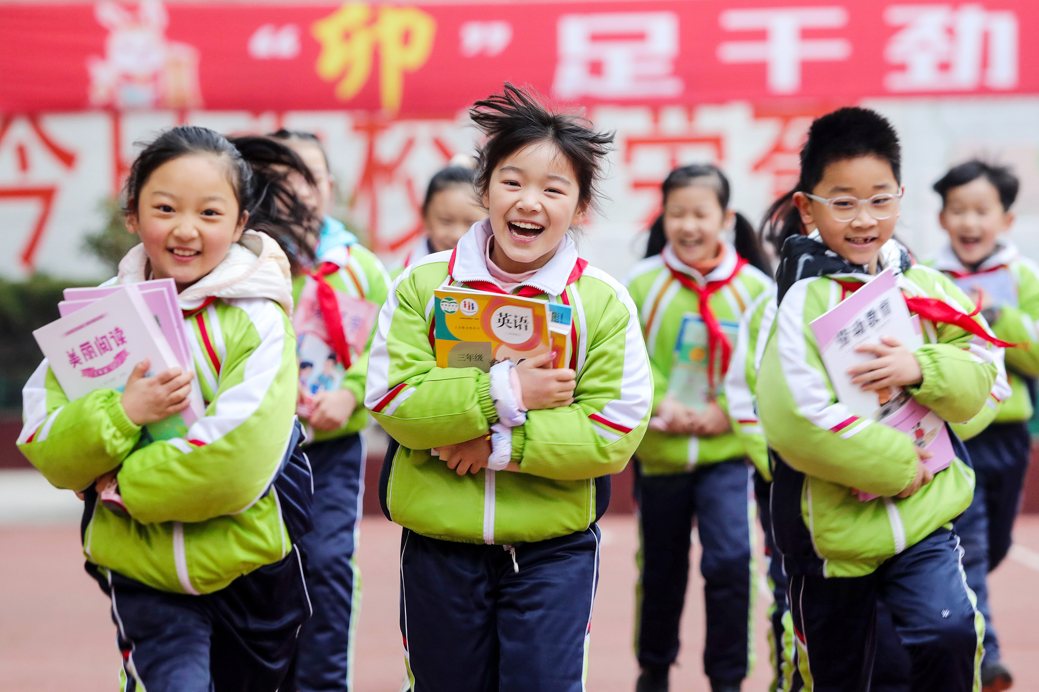 2月6日,安徽省淮北市第三实验小学,学生们领到新课本。