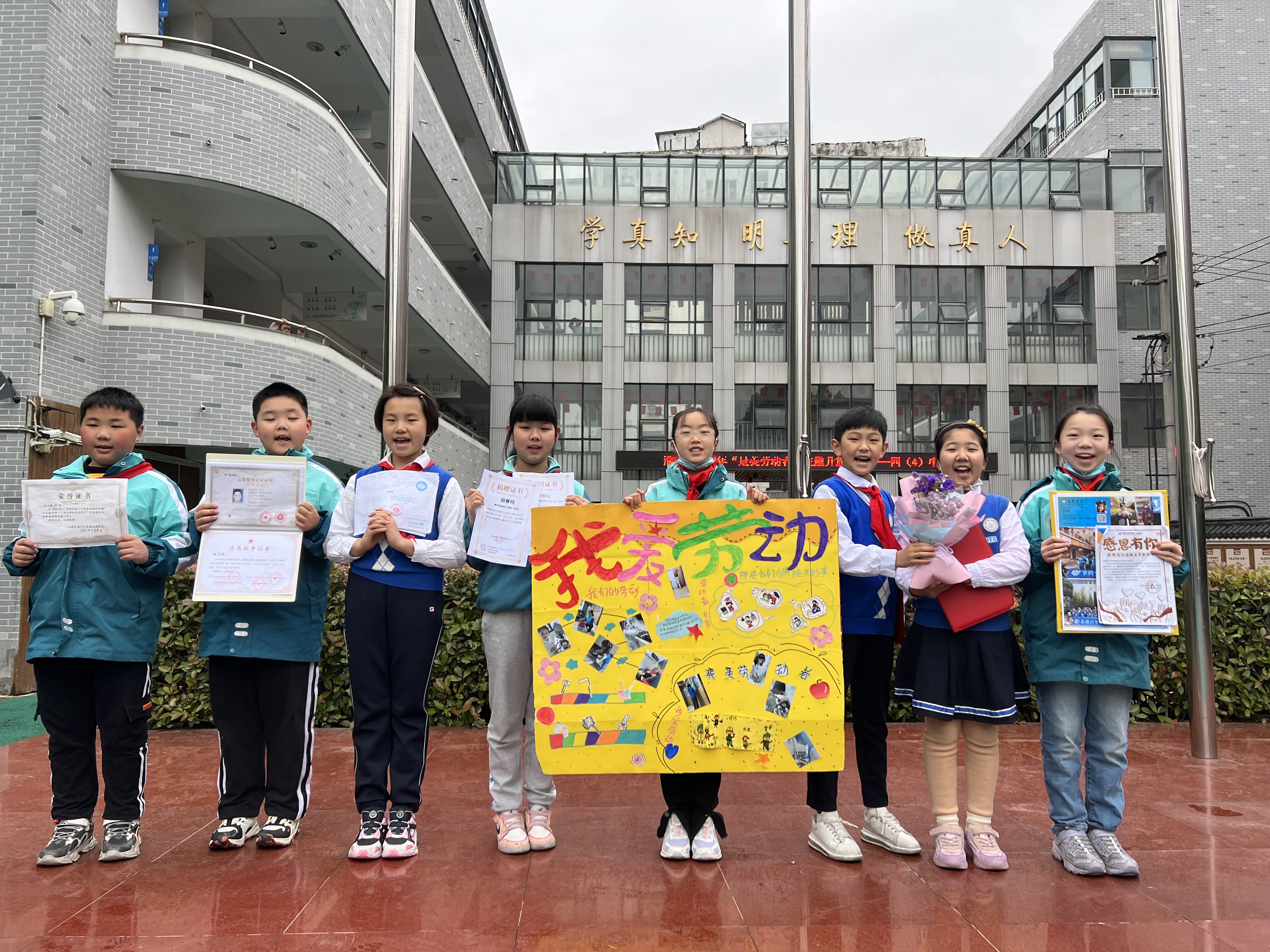 4月24日,合肥市淮河路第三小学教育集团杏花校区四(4)中队主持“致敬最美劳动者”主题升旗仪式。鲜艳的五星红旗在全校师生的注目下,随着国歌的节奏缓缓升向天空。