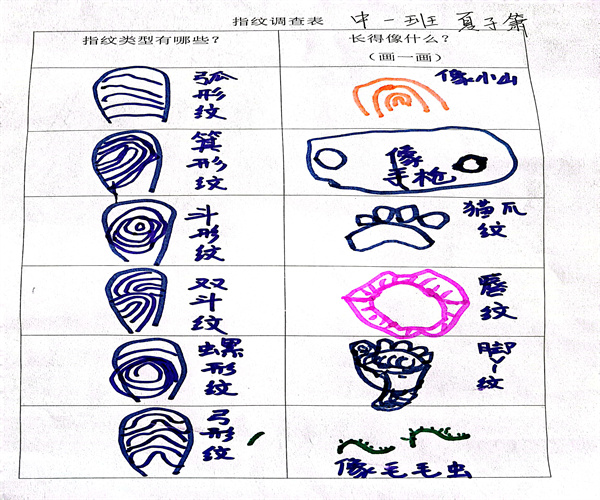 在孩子们的建议下,大家共同设计了亲子指纹种类调查表,回到家中一起和爸爸妈妈查阅资料,解答疑惑。