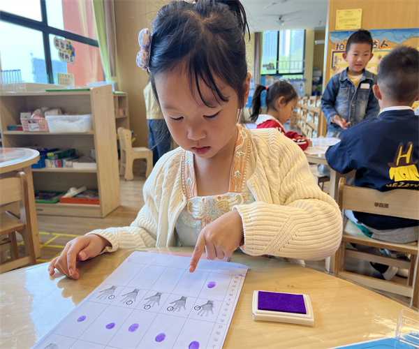 幼儿D:我刚刚把我每根手指的指纹都印了上去,你看有的像波浪、有的像水滴,都不一样呢!
