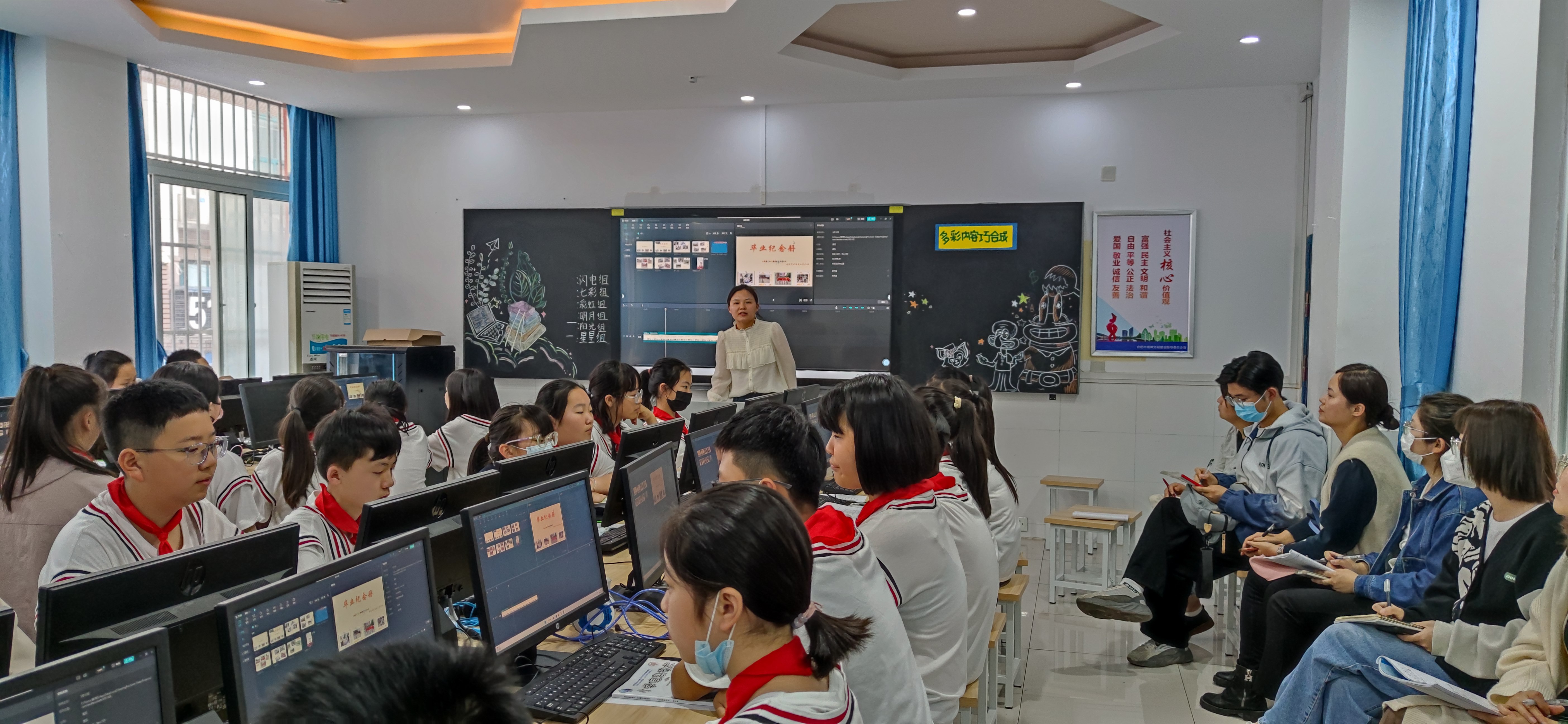 首先,由2022年合肥市小学信息技术优质课二等奖获得者合肥市兴海苑小学王蕾老师展示课例《多彩内容巧合成》。王老师利用六年级毕业班日常活动照片和班主任寄语视频等素材,通过时下流行的视频剪辑软件,引导学生采用自主探究的方式合成制作毕业留念视频。课堂内容贴近学生日常,帮助他们回忆六年来师生间的美好点滴,感恩自己、感恩同学、感恩师长;老师在信息软件的选择上与时俱进,大胆突破教材局限,使用学生熟悉的视频剪辑软件创意作品,再通过展学加互评的方式取长补短,进而优化作品。