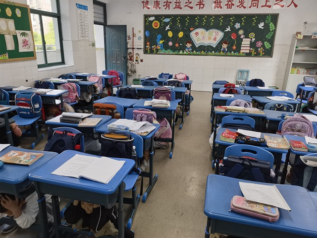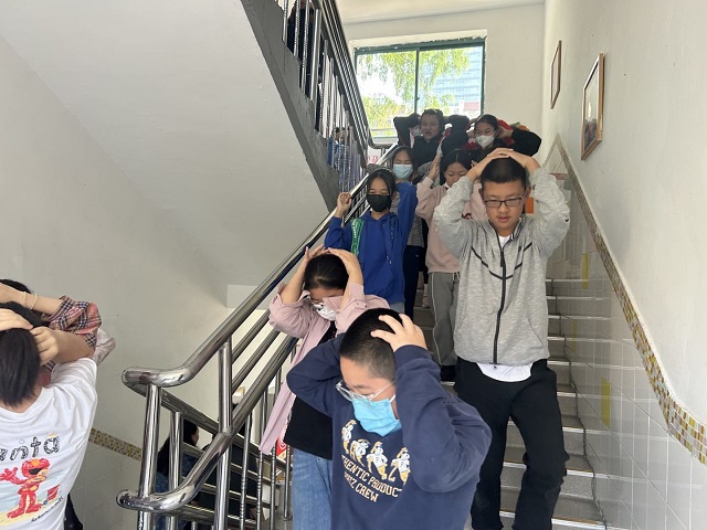 上午8点10分,演练正式开始。随着地震预警警报声响起,各班老师立即组织学生就近避险,引导学生迅速拿起课本保护头部,躲在各自的课桌下或课桌旁进行避险。地震预警第二声警报响起,各班同学们遵循指令,迅速做出反应,在班主任的带领下,安全撤离到疏散区域。整个疏散过程中,师生行动迅速,不喧哗、不推挤,井然有序。
