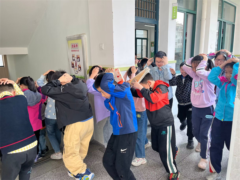 上午8:06分警报响起,全体师生抱头弯腰,躲在各自的课桌边,尽量蜷曲身体,降低身体重心,尽可能用书包保护头部。30秒后,主震警报解除,撤离信号响起,老师们第一时间组织学生按预订疏散路线迅速撤离到操场的中心位置,各点位老师在楼道出口、过道弯口处引导师生有序撤离,并清查各班是否存在滞留学生。全体师生到达操场后,各班迅速清点人数并上报总指挥。