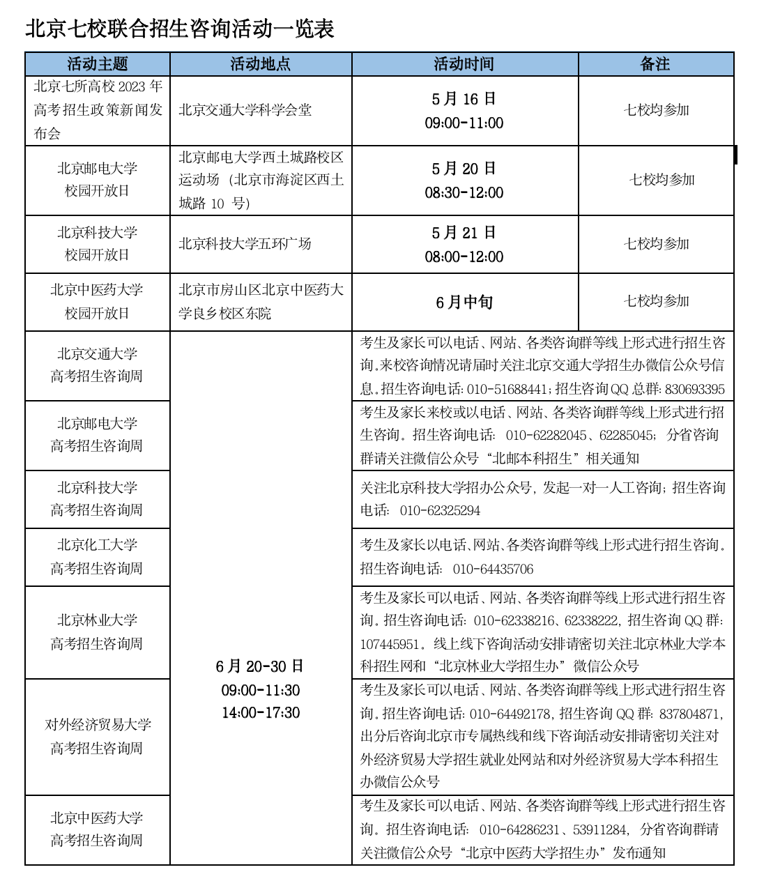 北京七校联合招生咨询活动一览表