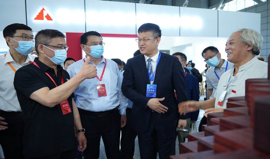 活动开始前,教育部职成司副司长林宇等与会领导来到“天职”展台参观,非遗技艺传承人辛全生团队正在现场组装世界上最大的鲁班锁——“大菠萝”,郑清春校长邀请林宇副司长一起为其安装上最后一根榫卯木条,现场爆发出热烈的掌声。郑清春校长介绍说,将鲁班锁与榫卯技艺引入学校课堂,这是对国家非遗技艺与文化最好的保护和传承,是对工匠精神的尊崇和发扬,最终是要引导学生养成严谨专注、敬业专业、精益求精和追求卓越的精神品质。郑校长还引导大家参观了综合验光仪学习流程与考核虚拟仿真系统、静电纺丝机等展品。