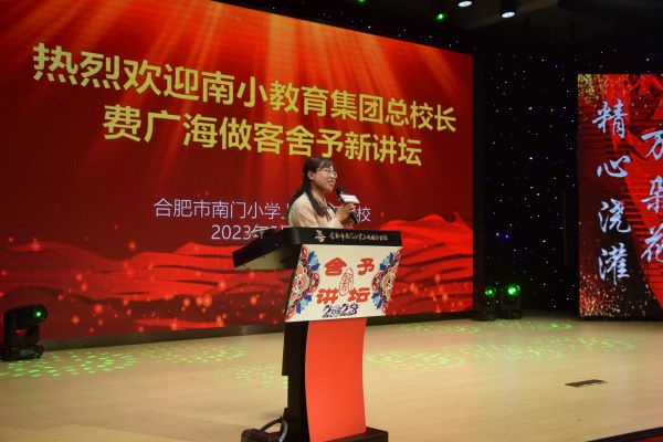 5月17日,合肥市南门小学上城国际分校“舍予新讲坛”第三期开讲。本期特邀全国五一劳动奖章获得者、合肥市南小教育集团总校长费广海主讲。副校长陈艳主持,校长王艳和全体教师参加。