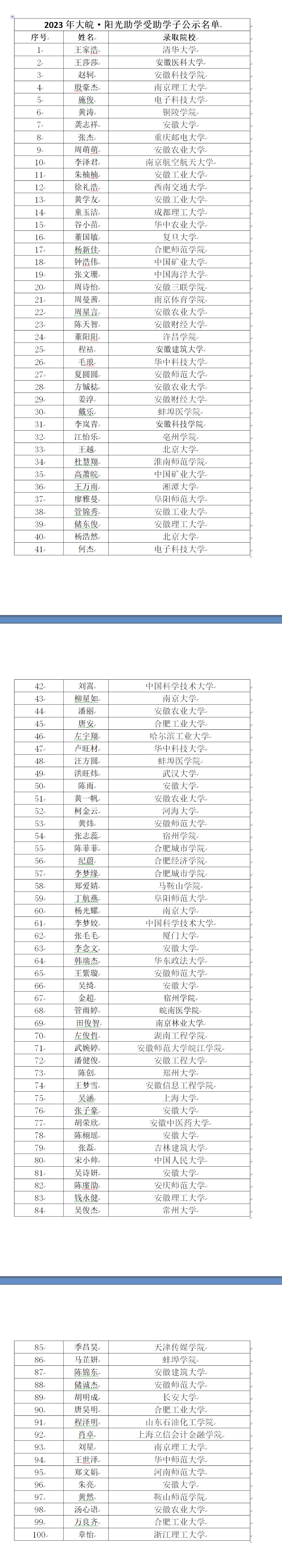 今日起,百名阳光学子名单将在安徽网和大皖新闻客户端上公示5天,接受社会监督,如有异议可拨打0551-65179518反映。公示结束后,8月22日下午,百名阳光学子将从全省各地齐聚合肥,在省图书馆参加2023大皖·阳光助学行动学子报告会暨助学金发放仪式,每位阳光学子将现场确认签字领取5000元助学金。届时,还有优秀阳光学子现场讲述励志成长故事和分享学习经验,欢迎广大家长、学生以及社会爱心人士参加,一起倾听阳光学子心声,免费入场。 大皖新闻首席记者 朱庆玲