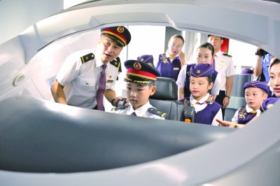 “小列车长”们在南京东机辆段动车运用车间参观模拟驾驶台。新华社发