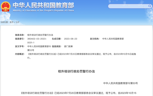 中国青年报客户端北京9月12日电(中青报·中青网记者 樊未晨)记者今天从教育部获悉,近日,教育部颁布了《校外培训行政处罚暂行办法》(以下简称《办法》)。该办法将于10月15日起施行。
