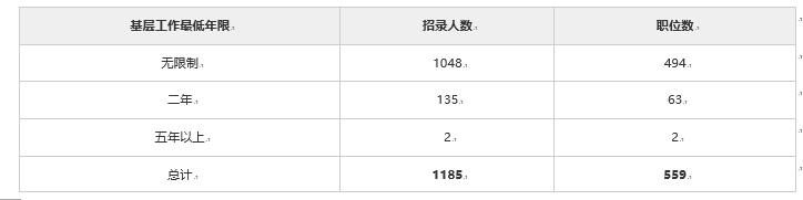 其中,不限基层工作年限的岗位占88.37%左右,要求两年工作经验的岗位占11.2%。只有极少数岗位要求5年工作经验,给高校毕业生更多的选择机会。