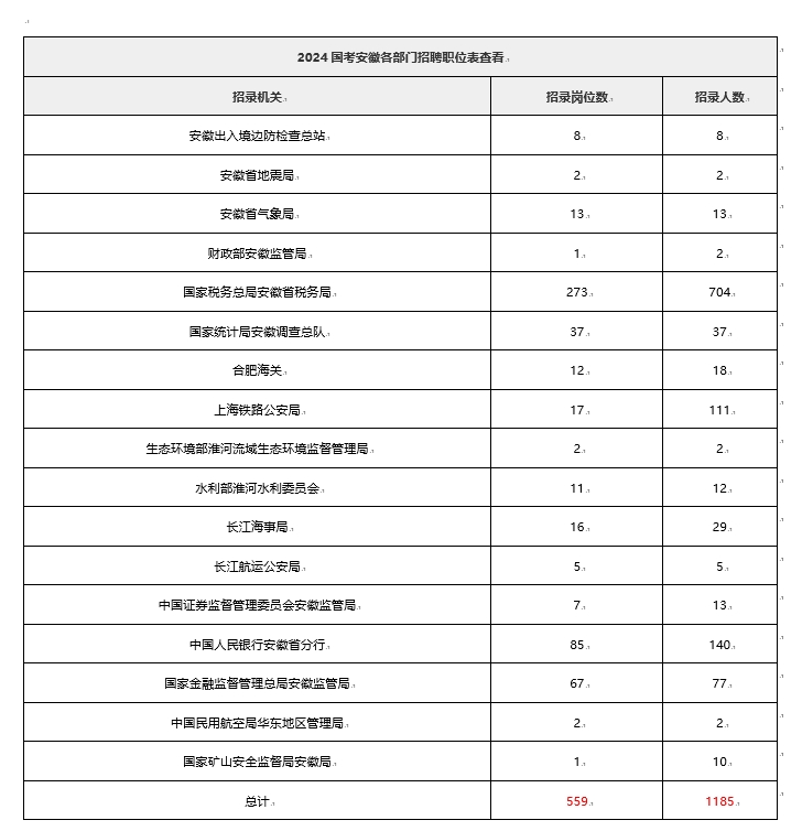 一、2024年安徽省共17部门参与国考招录,其中国家税务总局安徽省税务局招录人数依然最多,共计招录704人,273个岗位!占总招考人数的59.4%