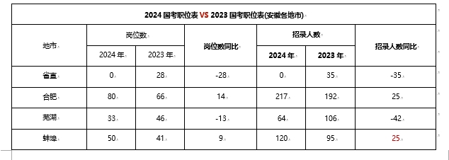 上表我们可以看出阜阳岗位相比2023年扩招33人!蚌埠、黄山、铜陵、六安、宣城招考人数增幅明显!