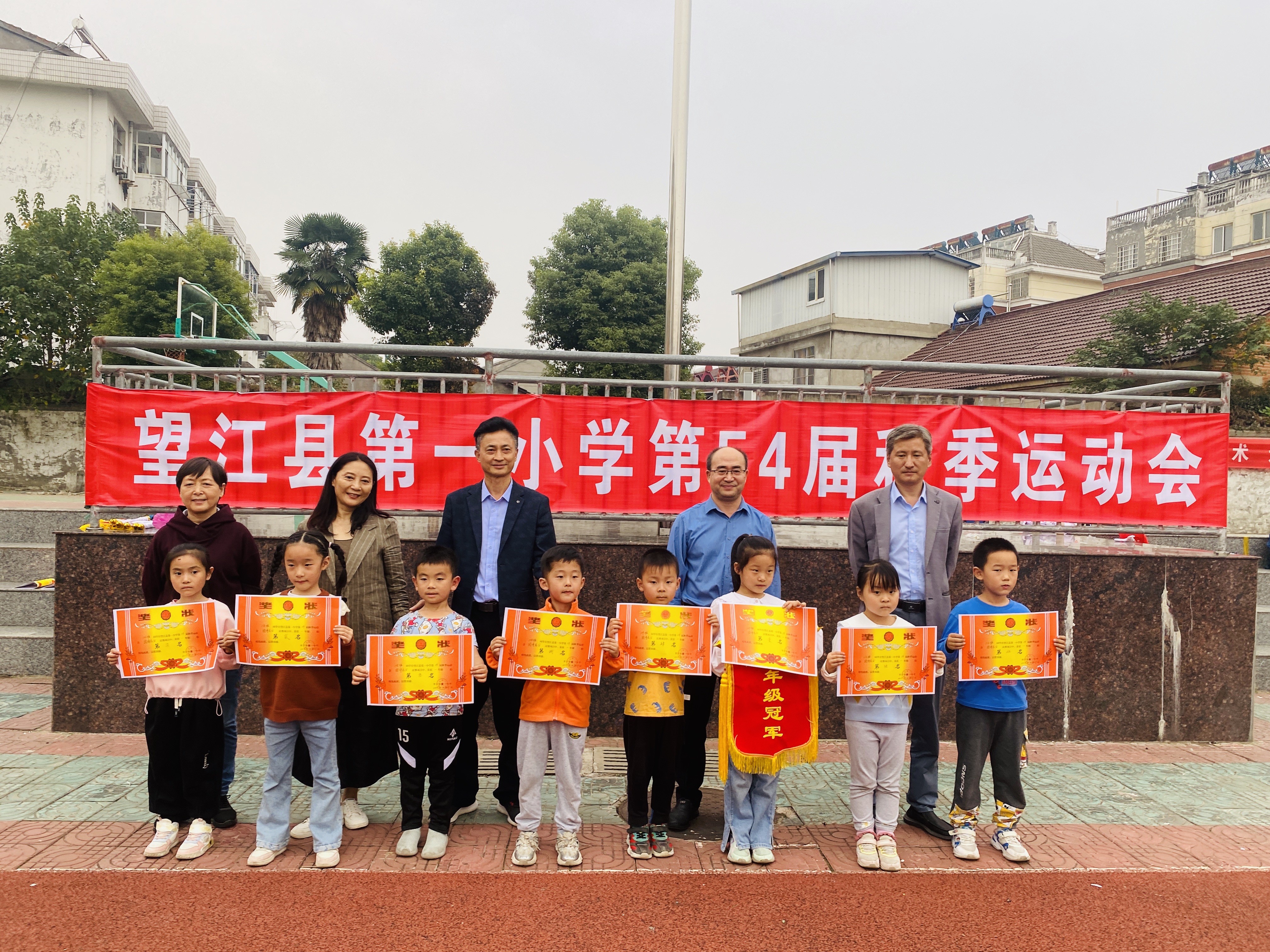 27日下午16时许,总裁判长汪兰老师宣布本次运动会破纪录名单和年级团体总分。望江一小班子成员及体育老师们为获奖班级及运动员颁发获奖证书。望江县第一小学校长何节兵致闭幕词,宣布望江县第一小学第54届运动会圆满闭幕!