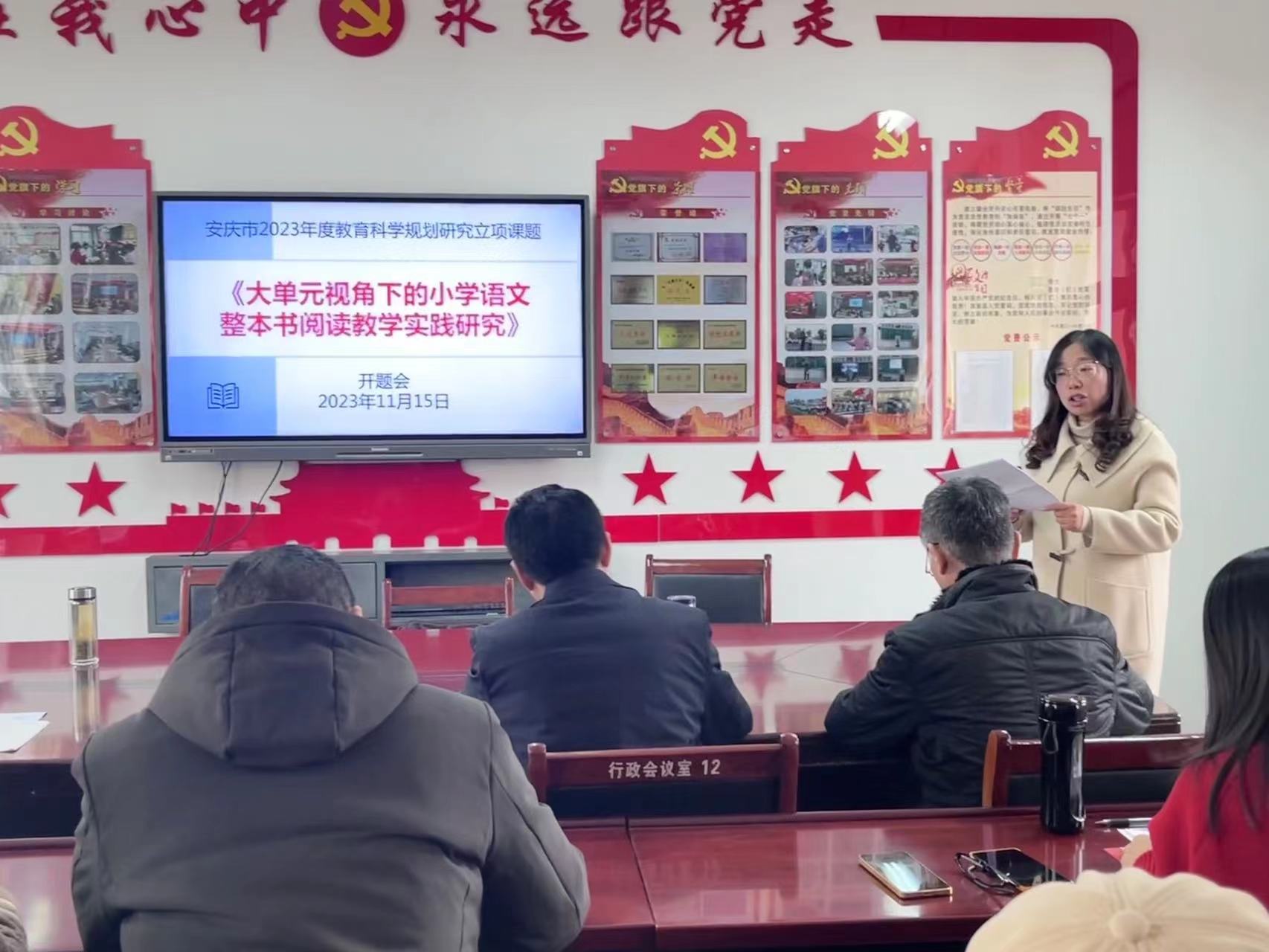 11月15日下午望江县第一小学举行市级教育科学规划研究立项课题《大单元视角下的小学语文整本书阅读教学实践研究》开题报告会。会议由朱金旺老师主持,特邀教研室韩主任、董主任、胡老师莅临指导,何校长、江校长及全体课题组成员参会。