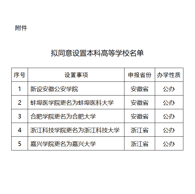 根据《中华人民共和国高等教育法》《普通高等学校设置暂行条例》《普通本科学校设置暂行规定》有关规定以及第八届全国高等学校设置评议委员会考察评议结果,经教育部党组会议审议,拟同意设置安徽公安学院等5所学校,现予公示。