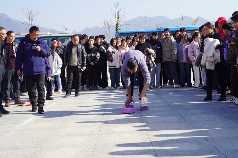 三块砖过河接力比赛上,队员们调整节奏,默契配合,团结协作,争分夺秒地完成比赛。