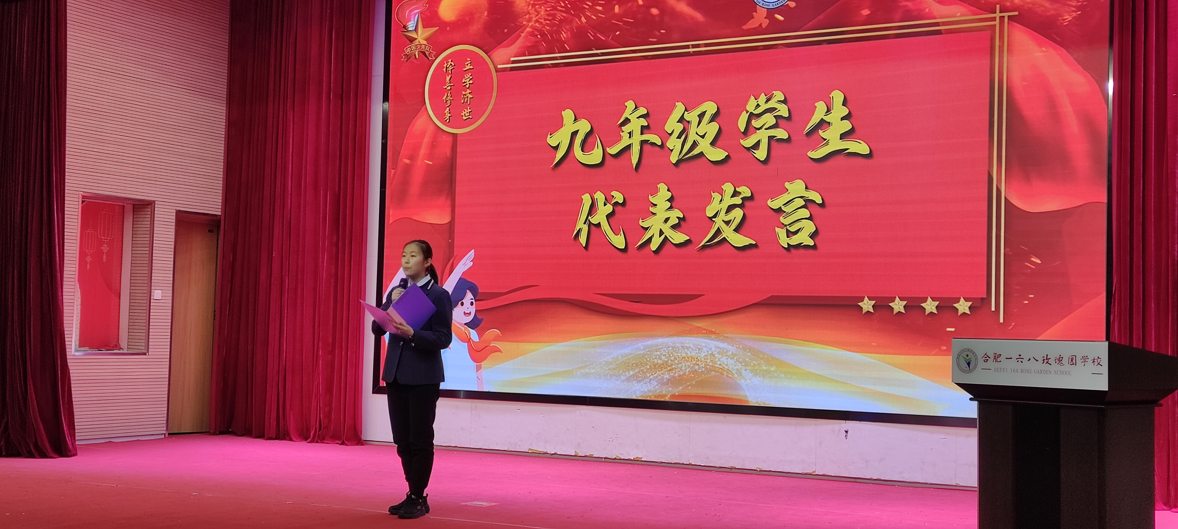 紧接着,来自九(10)班的周语诺同学代表九年级同学进行发言,对日常老师们的辛勤付出表示感谢,给学弟学妹们的学习方向提出中肯建议,对九年级同学们的备考之路发出呼号,引起在场观众的热烈掌声。