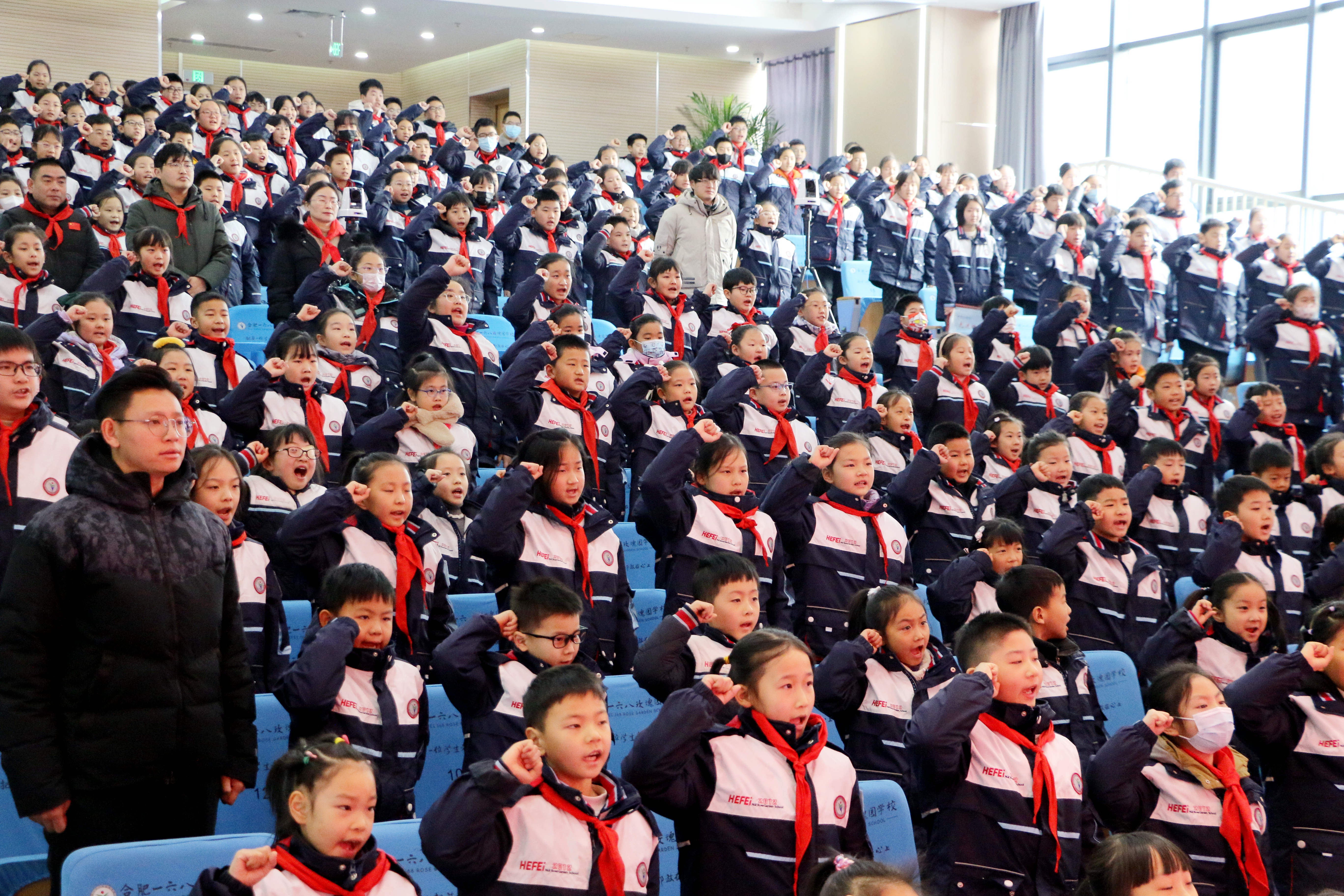在典礼最后,少先队辅导员舒会丽带领全体同学进行呼号,重温入队誓词。全体少先队员们,站姿挺拔、声音嘹亮,展现出玫瑰学子的昂扬奋进姿态。