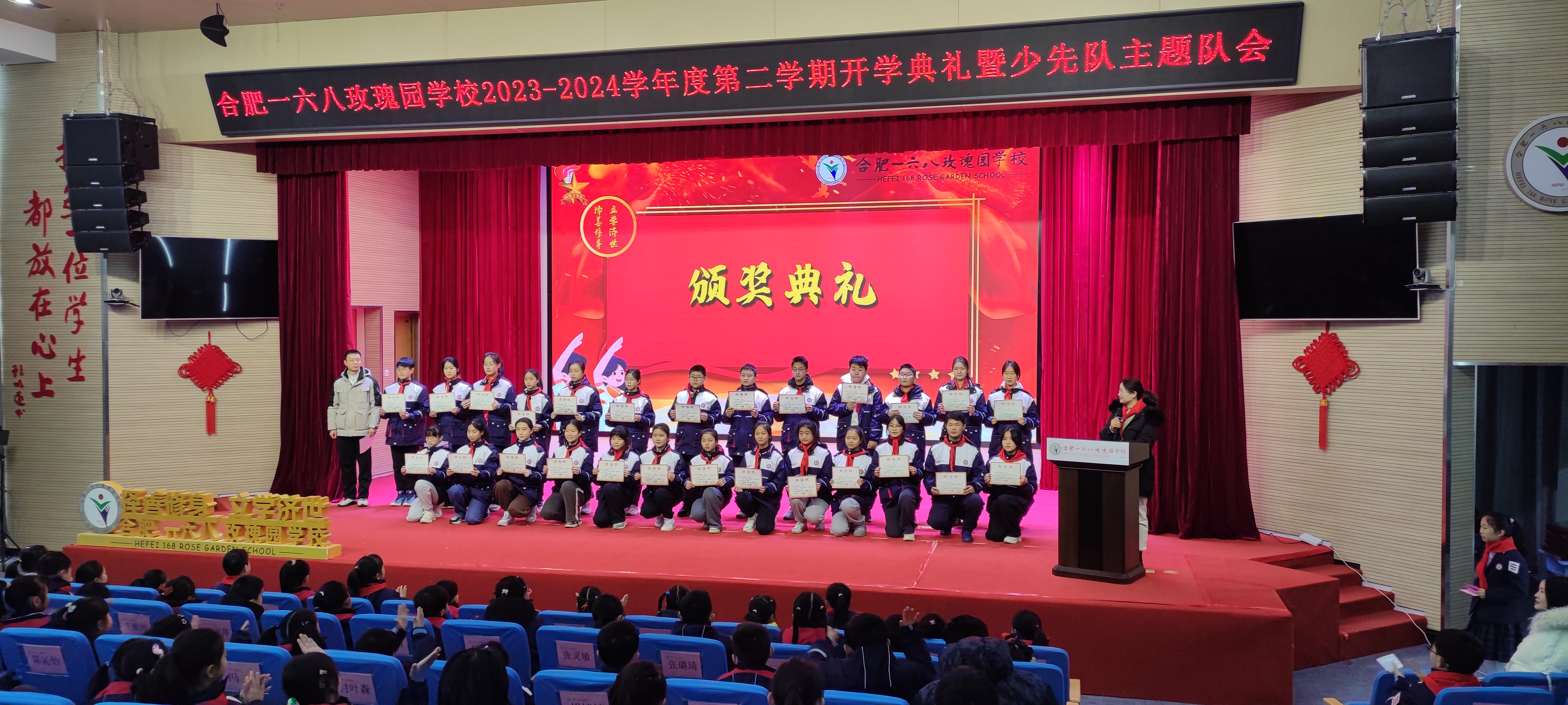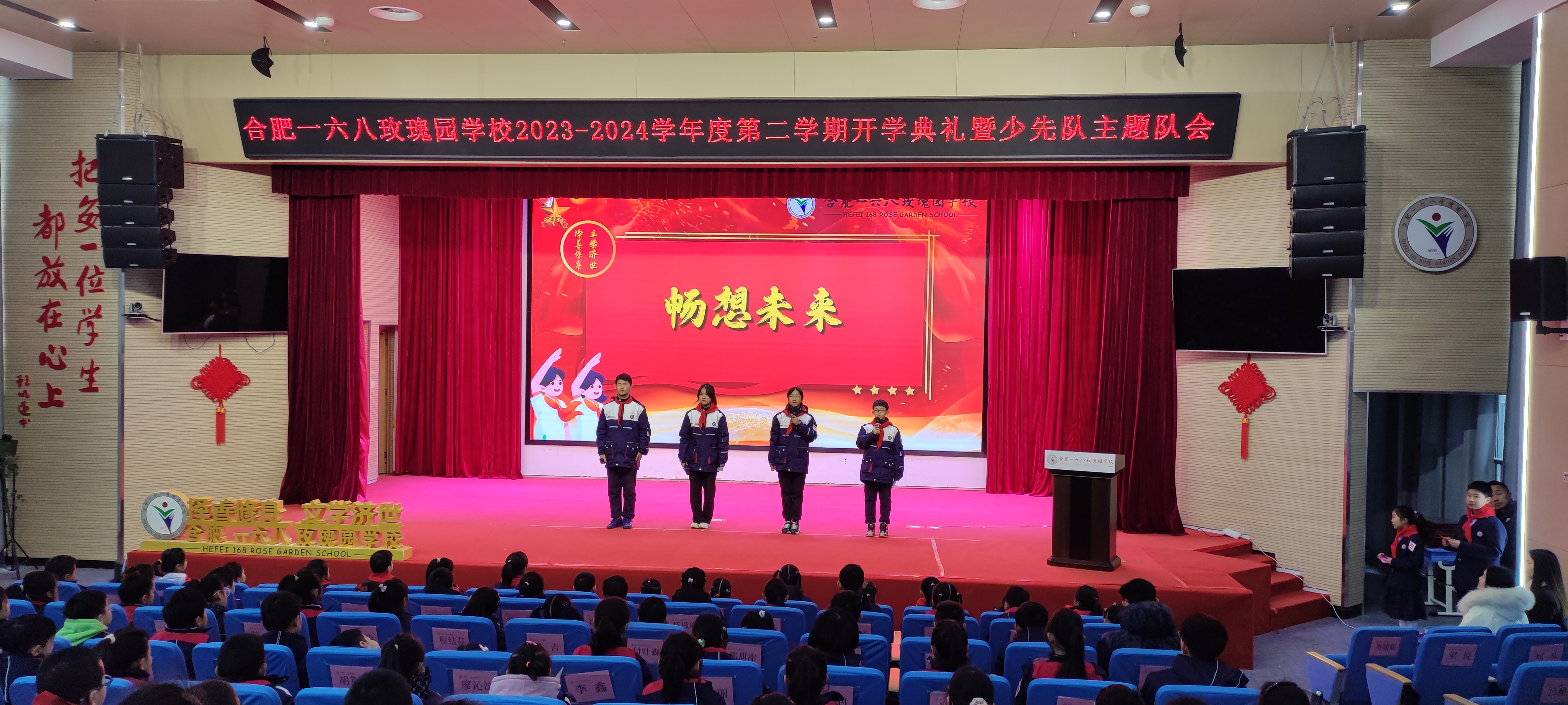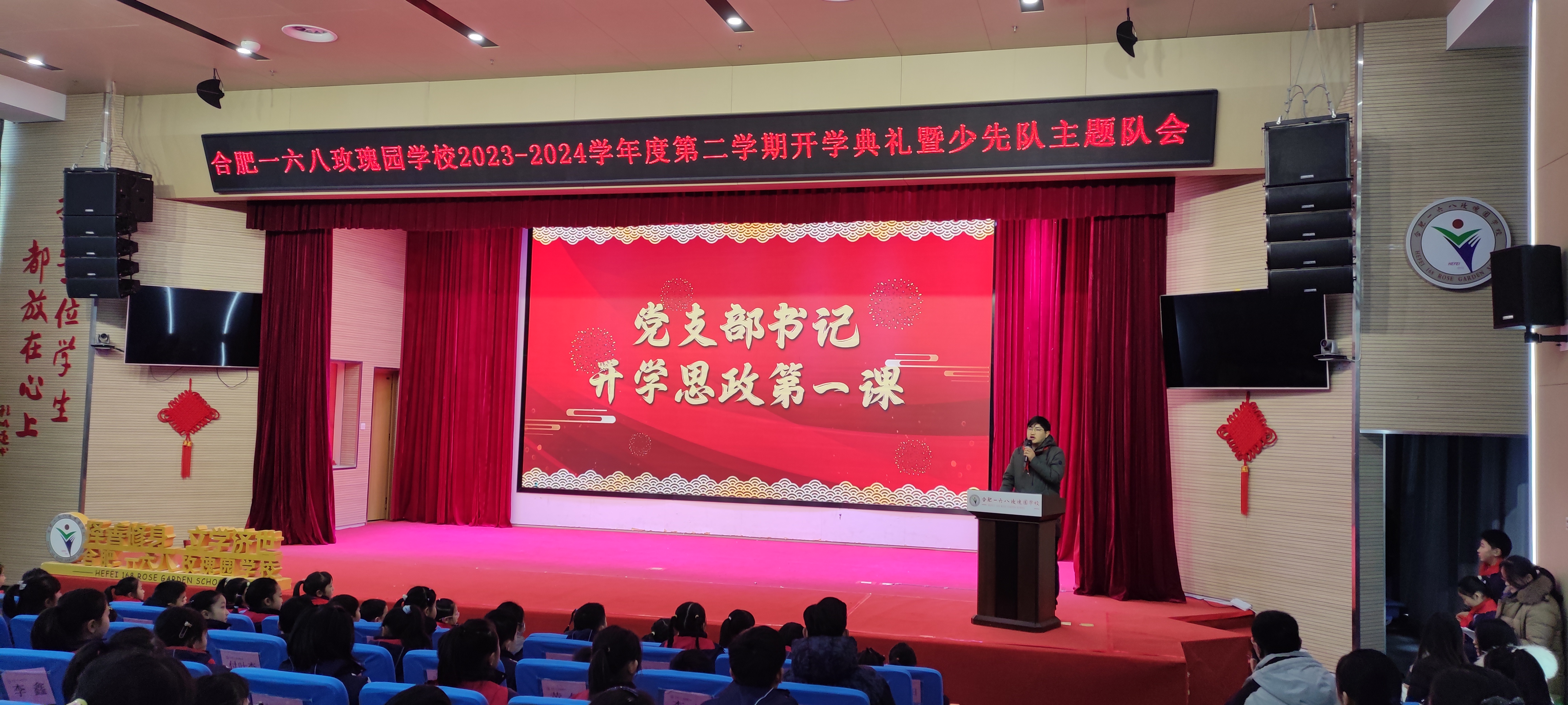 幸福玫瑰红,欢乐中国龙。为进一步加强学生爱国主义教育、理想信念教育、仪式教育,体现以学生为本、和美育人的教育理念,保障开学工作的安全、文明、有序、出彩,2月26日上午,来自该校各年级的师生代表、先进班级代表、优秀学生干部等齐聚一堂,共同参加合肥一六八玫瑰园学校2023-2024学年度第二学期开学典礼暨少先队主题队会活动。