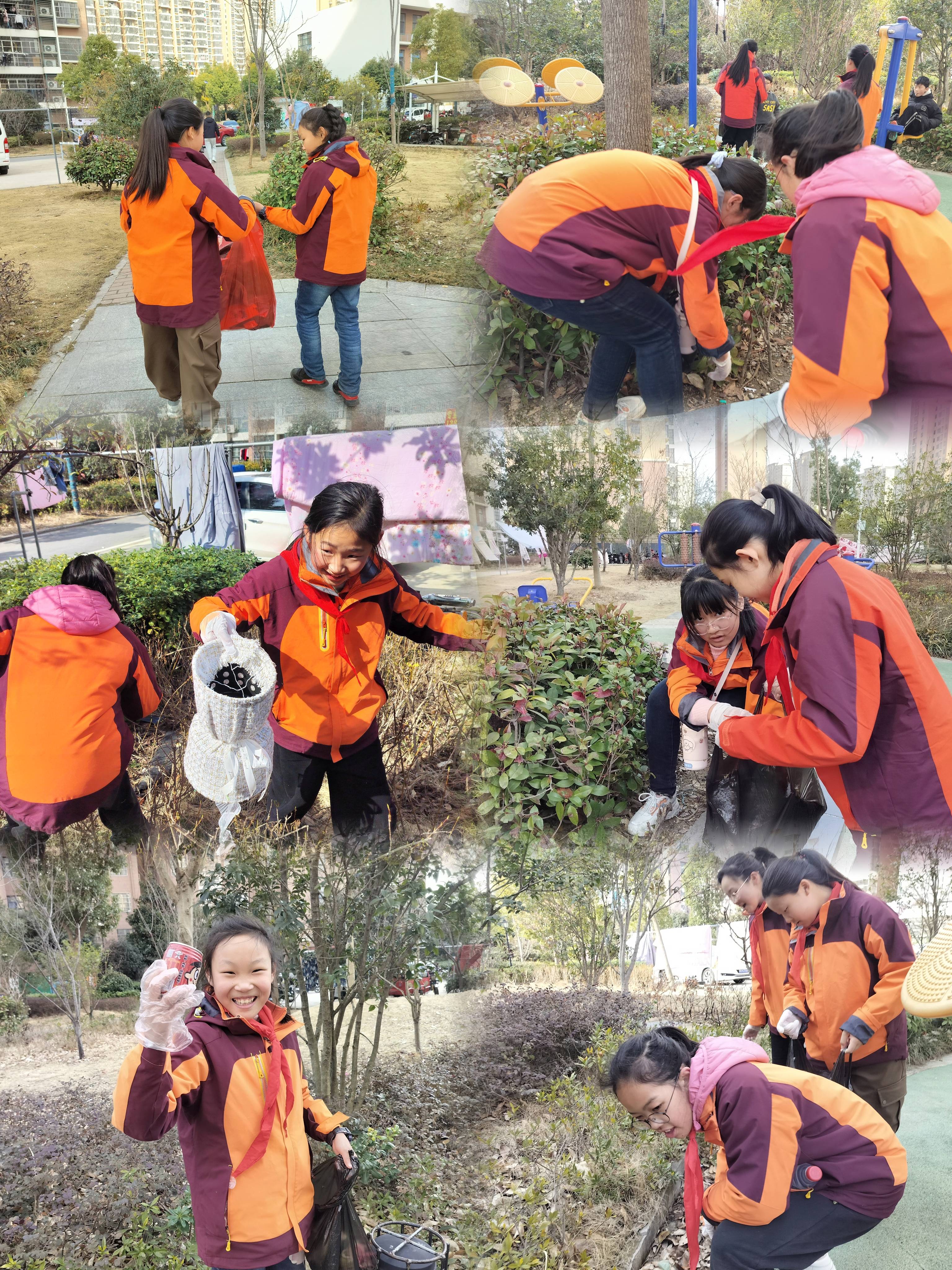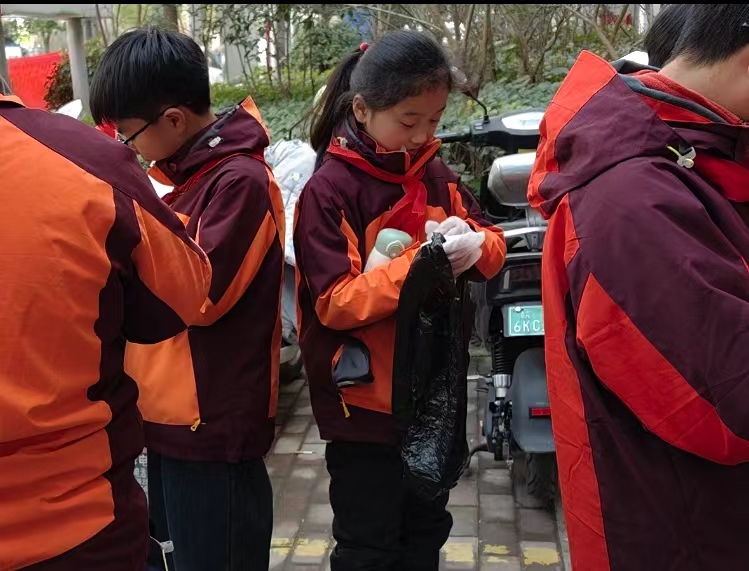 在社区工作人员和老师的带领下,队员们分成了男女两个小分队,在小区内的不同地点展开了垃圾“大扫荡”!