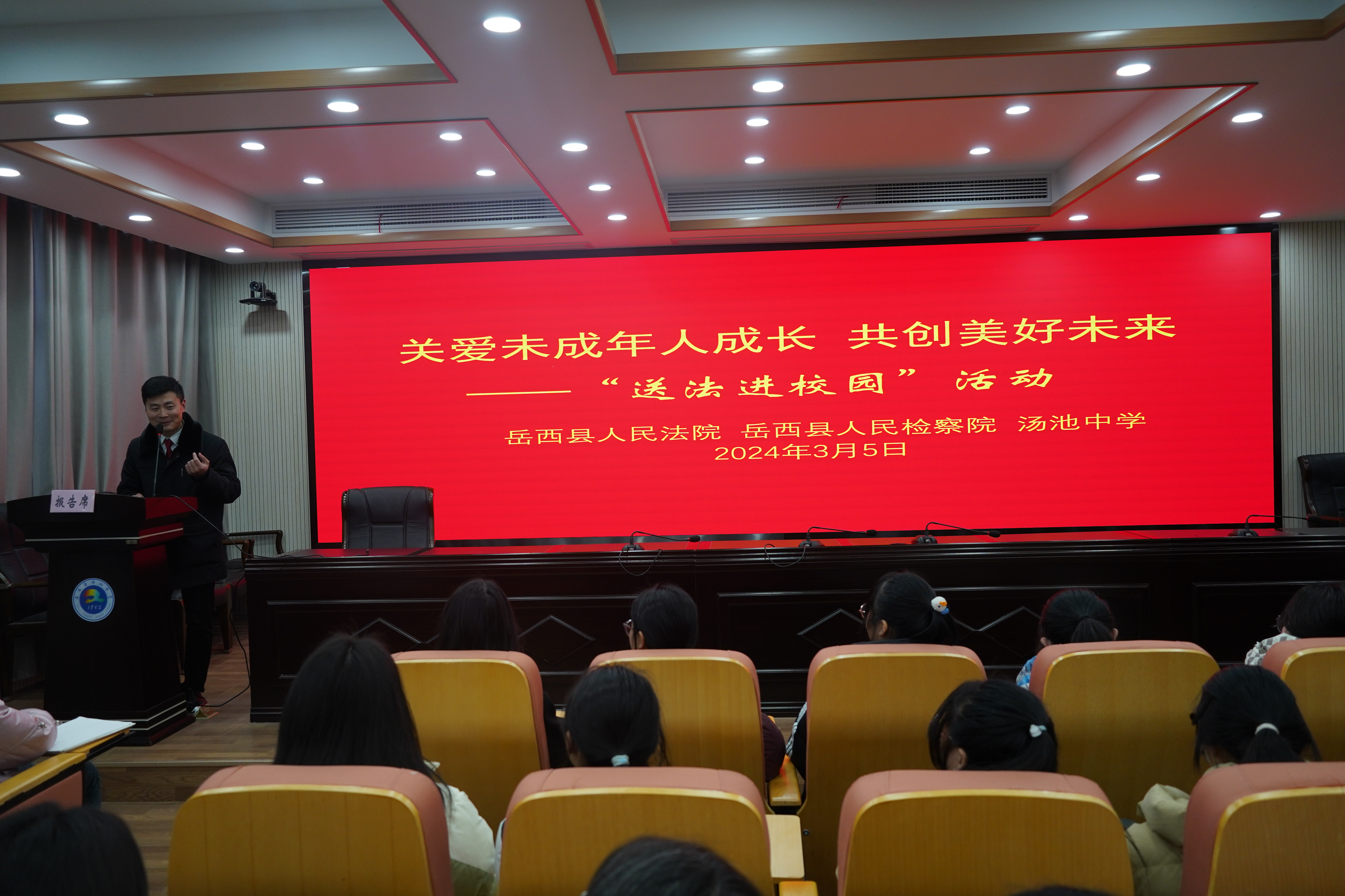 3月5日,岳西县人民法院、岳西县人民检察院到汤池中学开展“送法进校园,爱心助成长”活动。县法院党组书记、院长、汤池中学法治副校长徐杨,县法院、县检察院一行12人出席,汤池中学主要负责人、相关处室人员及高一年级女生参加。