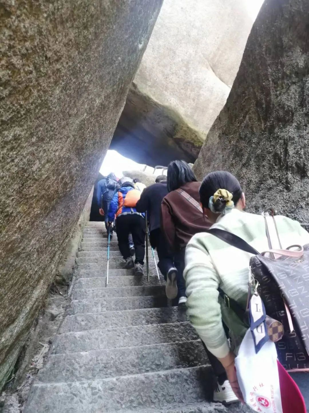 第三站:百步云梯。下山途中最惊险的莫过百步云梯了。一侧倚靠石壁,一侧峡谷幽幽。窄窄石梯层层而下,近乎垂直,令人两股战战。也难怪有人说:“通天云梯插苍穹,猴子见了也犯愁。”然而这并没有吓退大家爱美、爱记录的步伐。虽不能摆pose,整齐划一、绽放笑脸还是可以的。