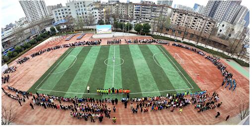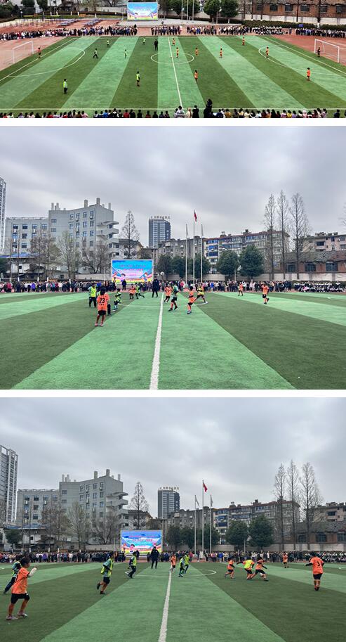 首先进行的是高年级足球校队的小将们带来的精彩展示,通过他们在场上奔跑、传球、射门等一系列动作,强调本次比赛的规则。观看中,场下的观众呐喊、助威,展现出了足球运动的魅力和活力。