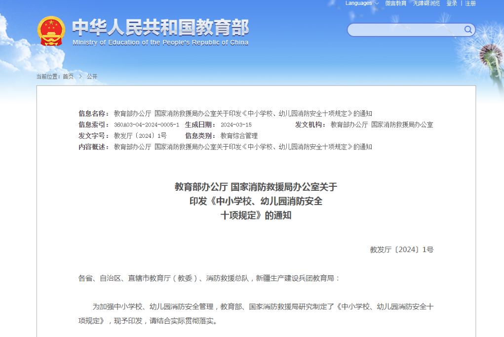 据新华社电 记者近日从教育部获悉,为加强中小学校、幼儿园消防安全管理,教育部、国家消防救援局研究制定了《中小学校、幼儿园消防安全十项规定》。规定明确,中小学校、幼儿园应定期开展教职工、安保人员消防安全培训。