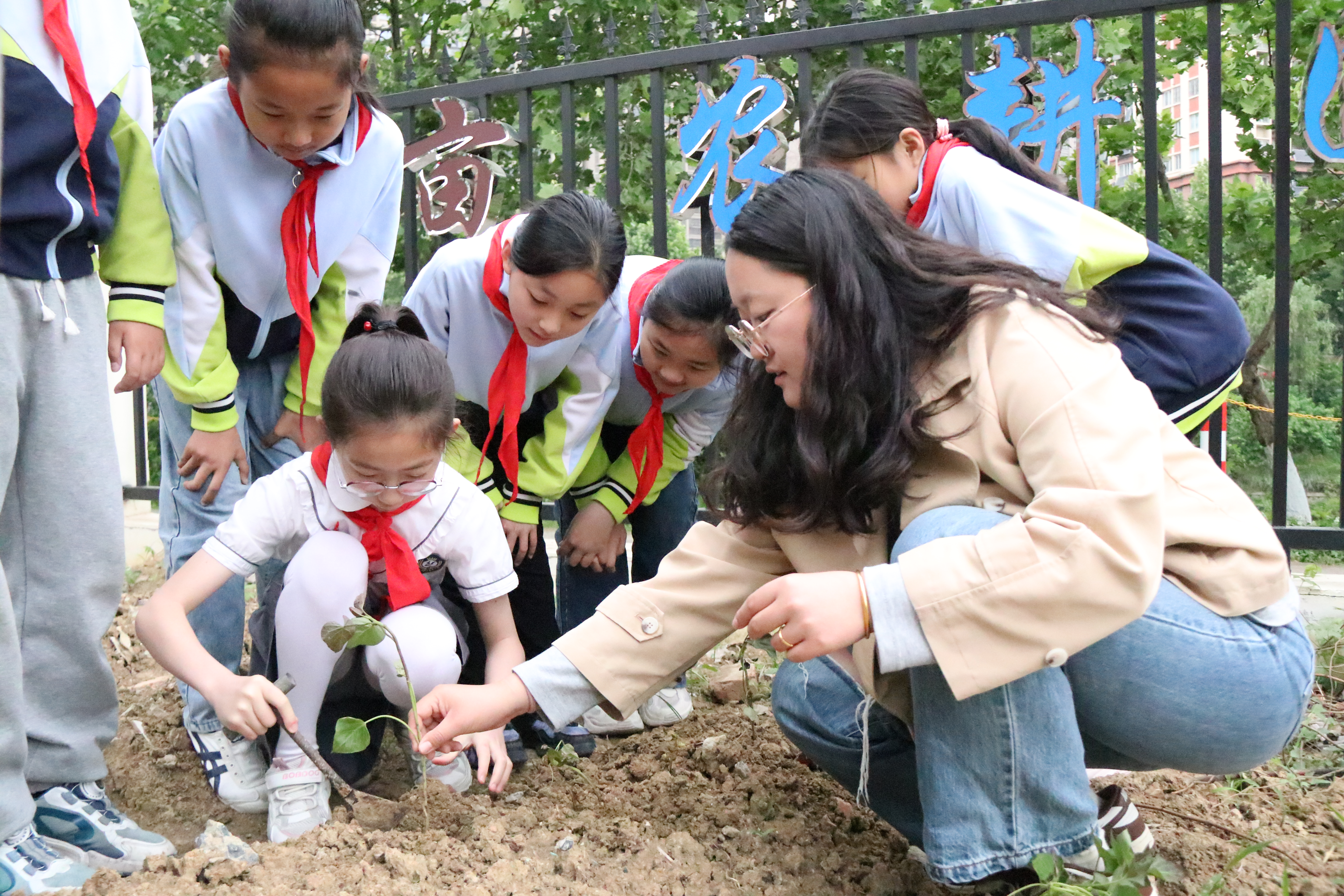 合肥市少儿艺术学校的学生在老师指导下在学校的劳动基地种植农作物