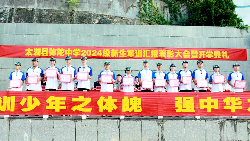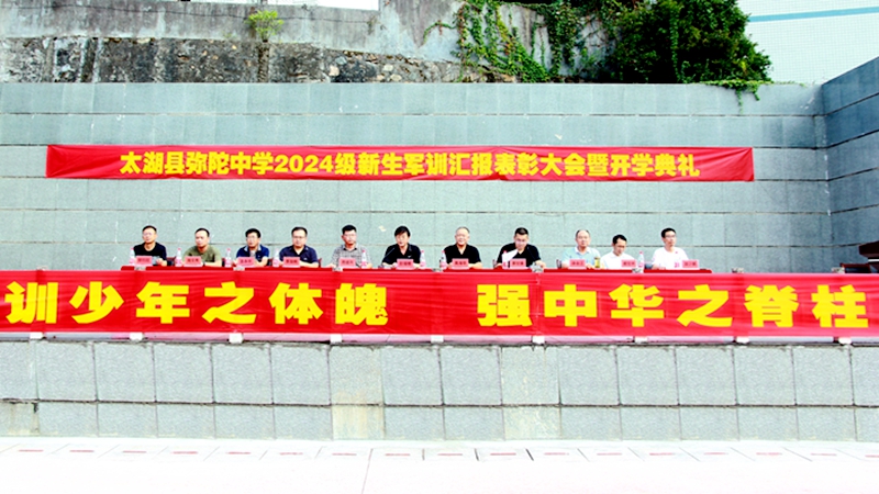 9月14日下午,太湖县弥陀中学2024级新生军训汇报表彰大会暨开学典礼在学校新运动场隆重召开,大会由副校长蔡甘泉主持,学校班子成员、弥陀镇政协联络组组长、学校二级机构负责人、全体军训教官、高一年级部班主任及全体高一新生参加大会。