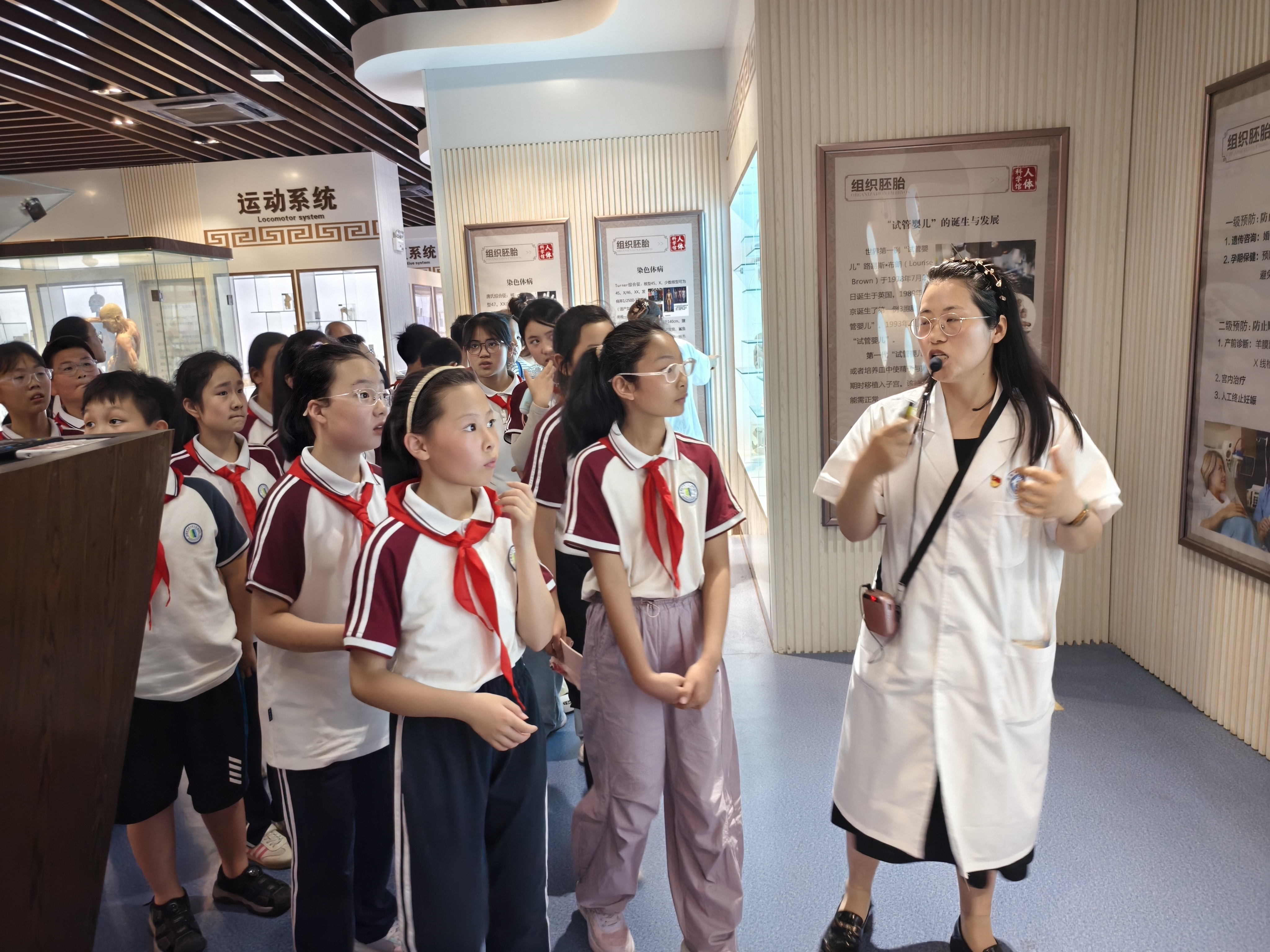 在两校党员教师的引导下,小学生们有序踏入中医药大学人体科学馆。这座充满奥秘的知识殿堂,宛如一本立体的生命教科书。形态逼真的人体标本、精妙复杂的解剖模型、生动直观的科普影像,化作一个个引人入胜的生命故事。中医药大学党员教师化身“科普使者”,深入浅出地讲解骨骼系统、脏腑功能及生命运行原理。孩子们时而凝神倾听,时而驻足思索,时而惊叹连连,在探索中感受生命的神奇与伟大。