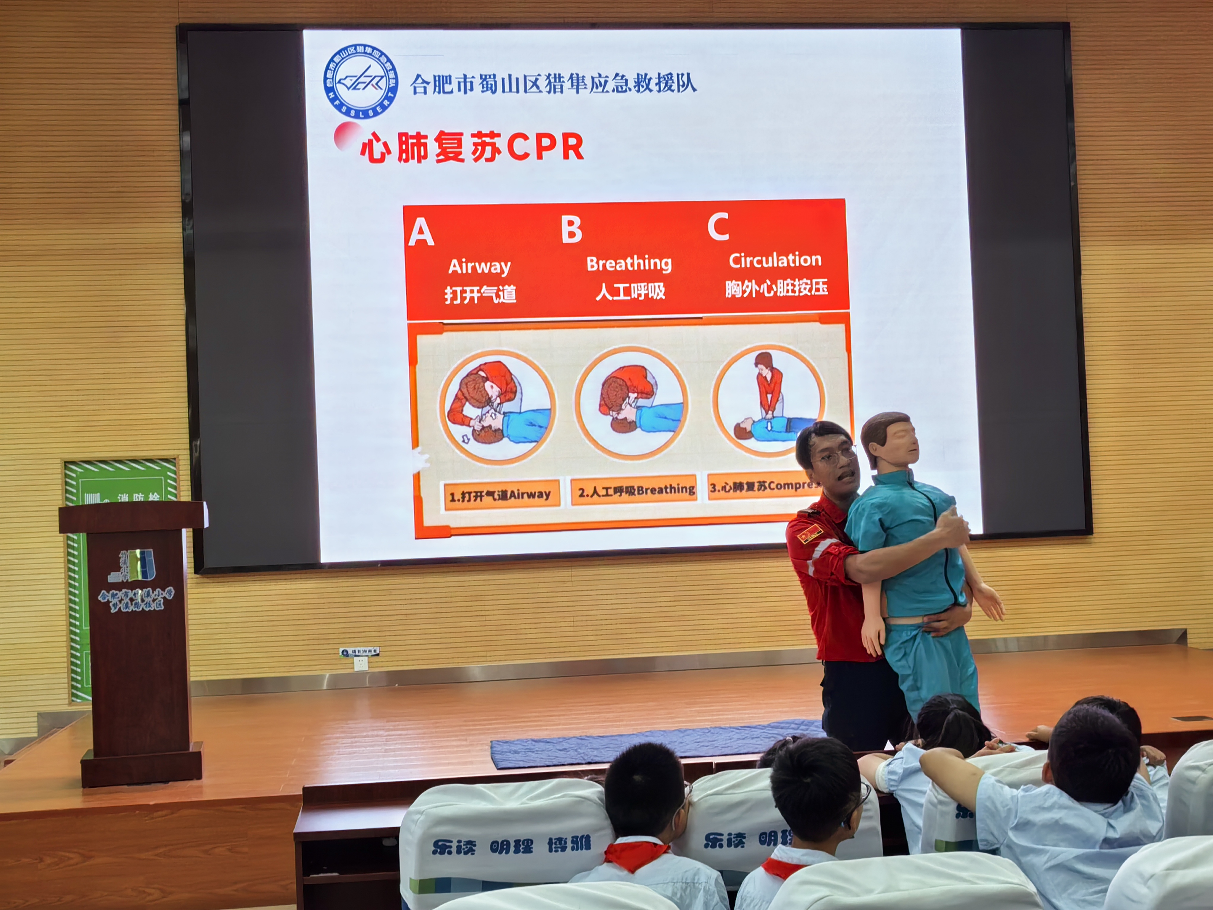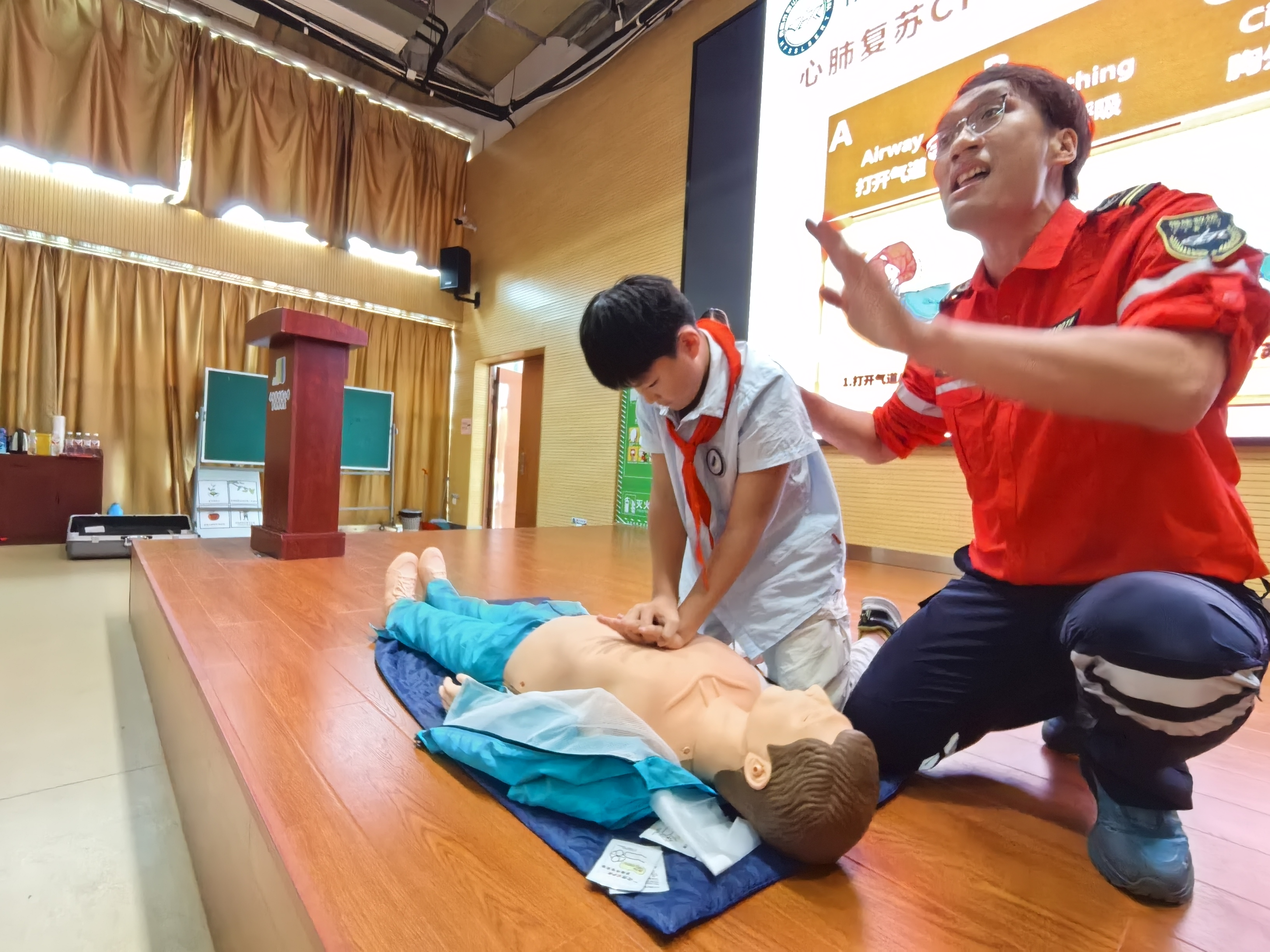 梅老师还认真讲解演示心肺复苏CPR,并邀请同学上台进行模拟练习。