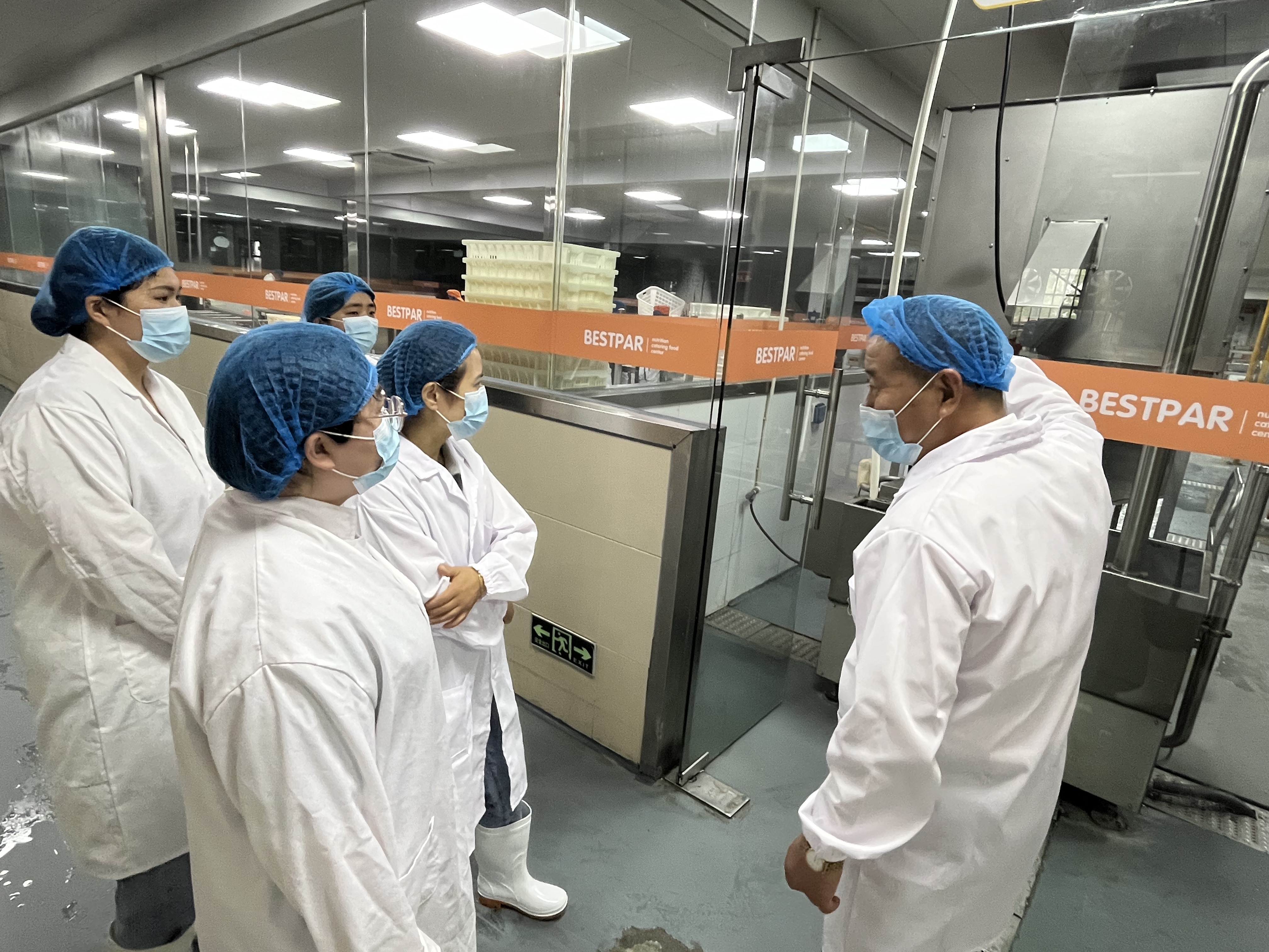 随后,在工作人员的引导下,家长代表们严格按照卫生要求,穿戴好工作服、鞋套,经过风淋消毒等环节,进入生产车间。在干净整洁、分区明确的生产区域内,家长们依次参观了蔬菜清洗区、食材加工区、烹饪区、分餐区等区域。每到一处,家长们都仔细观察,并不时提出问题。工作人员针对家长们关注的食材采购渠道、加工流程规范、餐具消毒方式、食品留样标准等问题,进行了专业且细致的解答。