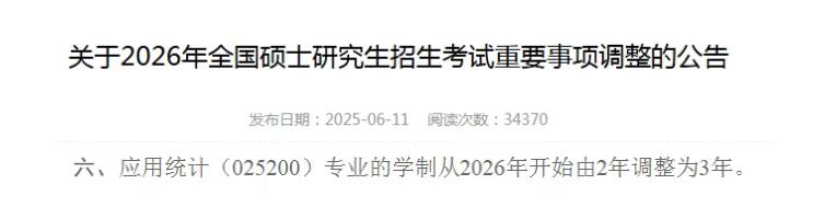 6月11日,中央民族大学发布《关于2026年全国硕士研究生招生考试重要事项调整的公告》,明确规定:应用统计(025200)专业的学制从2026年开始由2年调整为3年。